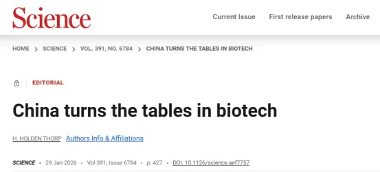 《Science》主编H. Holden Thorp教授最新社论明确指出:中国在生物制药领域的崛起速率超乎预期,已从20年前的“追赶者”转变为当下“并驾齐驱”的竞争者。这一局面正在被中国改写。值得关注的是,这并非偶然现象,而是中国精心策划的“科技逆袭”,背后蕴含着生命科学领域的全新战略。