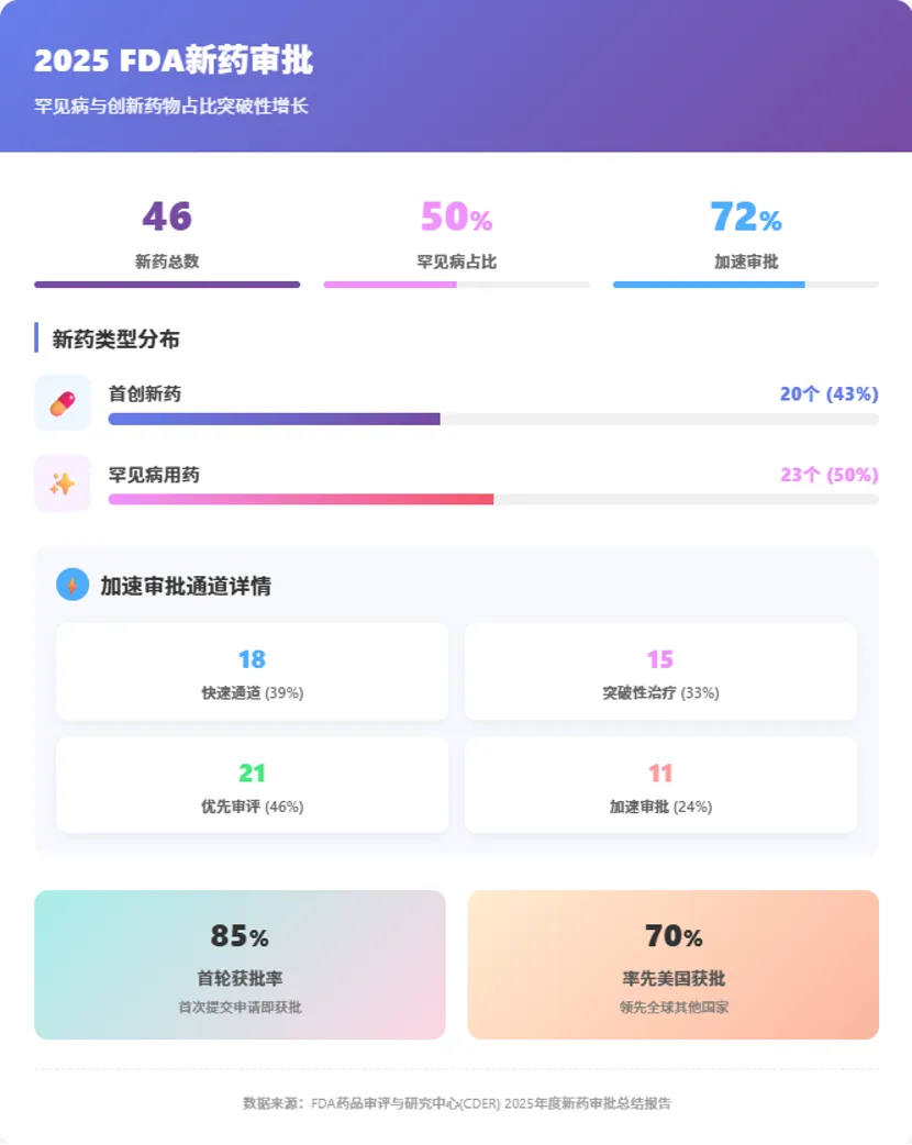 根据报告,2025年CDER批准了46个新药,其中首创新药(FIC)占比高达43%。这一数据显示出美国医药行业在创新疗法开发上的强劲势头。罕见病治疗领域更是创下历史纪录,获批新药中有50%是针对罕见疾病的疗法,平均每两个新药中就有一个聚焦于小群体患者的医疗需求。更引人注目的是,72%的新药通过了一项或多项加快开发和审评方法获得批准,FDA的高效审评机制为创新疗法快速进入市场开辟了绿色通道。