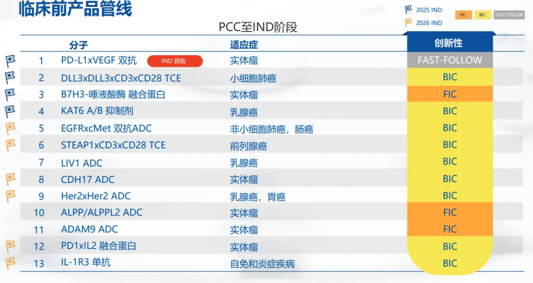 在临床前,公司通过两款重磅分子(22和43),以及多特异性 T 细胞衔接器(Hinova TCE)、自主 ADC 平台(Hanjugator™)以及 AI 驱动的 HAI Club,来证明了自己有对标世界前沿的药物发现能力。目前,公司在ADC、多抗、TCE等一系列创新机理分子领域已经完成了新一轮候选管线的全球化布局。
