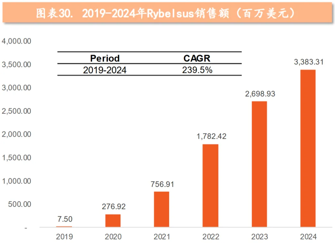 Rybelsus在上市以来的放量体现了口服赛道的高成长性,从2019年的700万美元销售额,增长到2024年接近34亿美元,CARG约239.5%。本次在美国减重适应症的获批及上市销售,将进一步推高加快司美口服剂型的全球销售达峰。