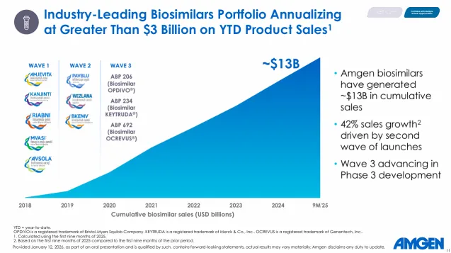 刚刚前不久结束的JPM会议上,作为全球生物类似药的领航者安进生物,透露道其目前已经上市七款生物类似药,累计销售额已经超过130亿美金,仅2025年销售额就达到了30亿美元左右,并且未来将不断加大在此方面的研发投入。