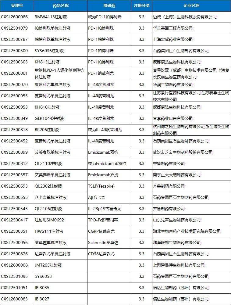 2025年以来3.3类抗体相关生物类似药申报情况(CDE官网)
