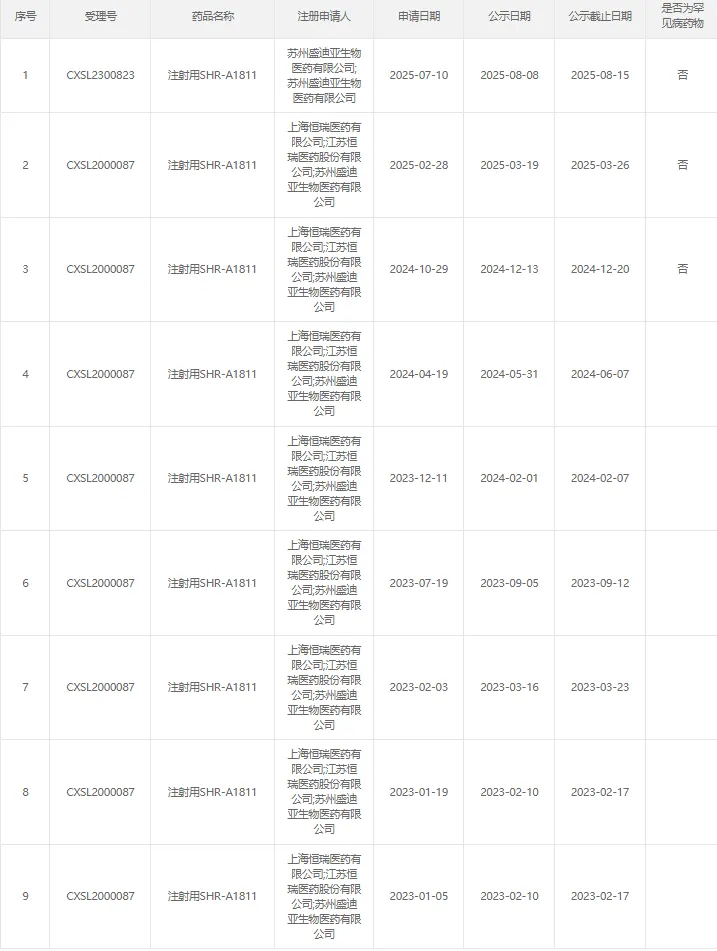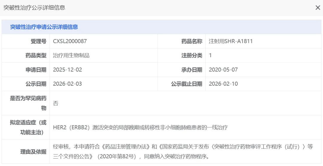 2026年2月3日,恒瑞医药HER2 ADC新药SHR-A1811一线治疗HER2激活突变NSCLC拟纳入突破治疗药物程序。