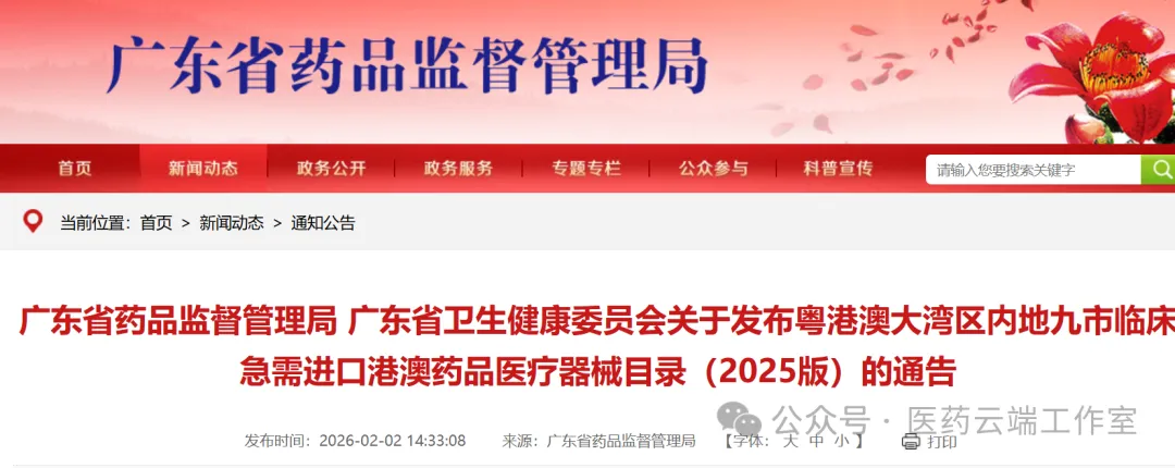 2月2日,广东省药监局、广东省卫健委发出《关于发布粤港澳大湾区内地九市临床急需进口港澳药品医疗器械目录(2025版)的通告》。