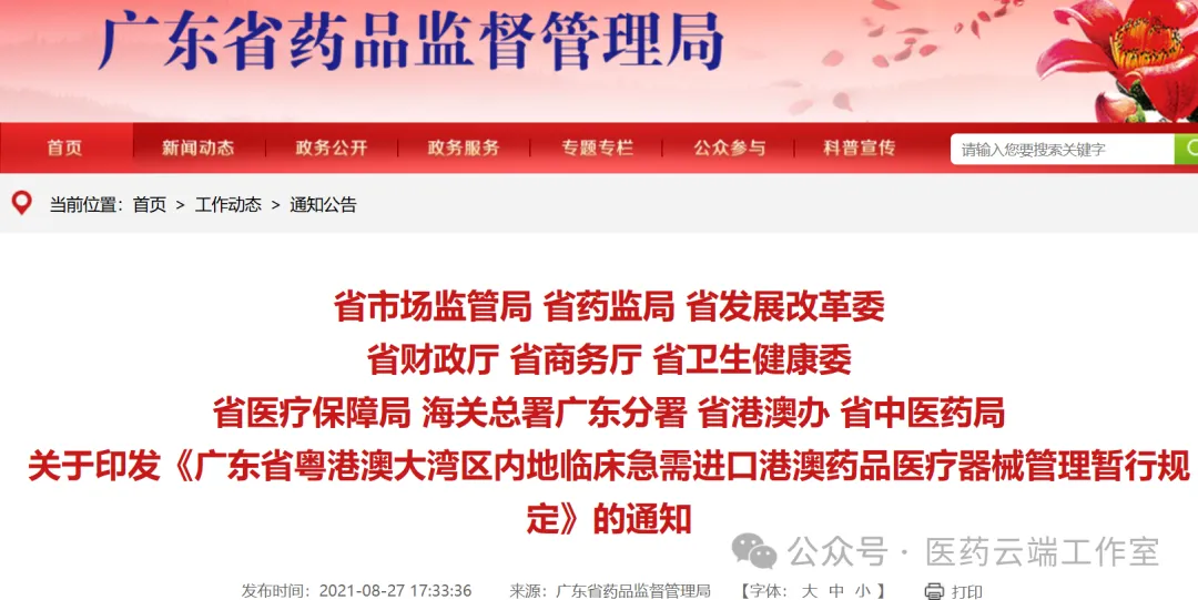2021年8月,广东省药监局联合省市场监管局、省发改委、省财政厅、省商务厅、省卫生健康委、省医疗保障局、海关总署广东分署、省港澳办、省中医药局等部门依据《粤港澳大湾区发展规划纲要》《工作方案》等政策文件和《行政许可法》《药品管理法》及其实施条例、《医疗器械监督管理条例》《药物临床试验质量管理规范》等法律法规,制定了《广东省粤港澳大湾区内地临床急需进口港澳药品医疗器械管理暂行规定》(以下简称《暂行规定》)。