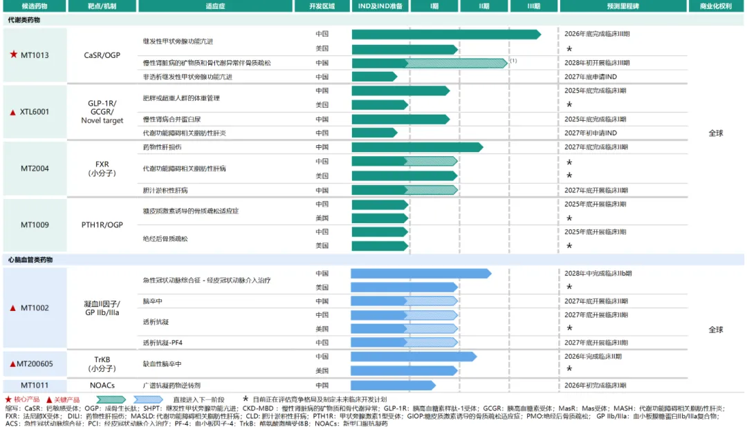 MT1013为全球首创的双靶点受主激动剂多肽,可同时靶向钙敏感受主(CaSR)及成骨生长肽(OGP)受主,开发主要用于治疗继发性甲状旁腺功能亢进症(SHPT),并计划拓展至包括慢性肾病性矿物质和骨代谢异常(CKD-MBD)伴骨质疏松及未接受透析的SHPT在内的额外适应症。MT1013已于2025年5月完成了针对SHPT的II期临床研究(MT1013-II-C01),并已进入以西那卡塞为对照的III期临床研究。