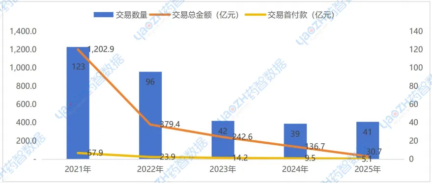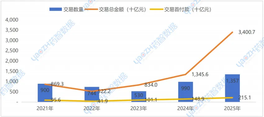 根据药智数据不完全统计,2025年全球范围内医药交易数量和交易金额大幅增加,其中药品交易数量达1357笔(同比增加37%),远超前两年增长水平;总交易金额增至3.4万亿元(同比增加152.7%),交易首付款为2151亿元(同比增加44.4%),均突破历史记录。