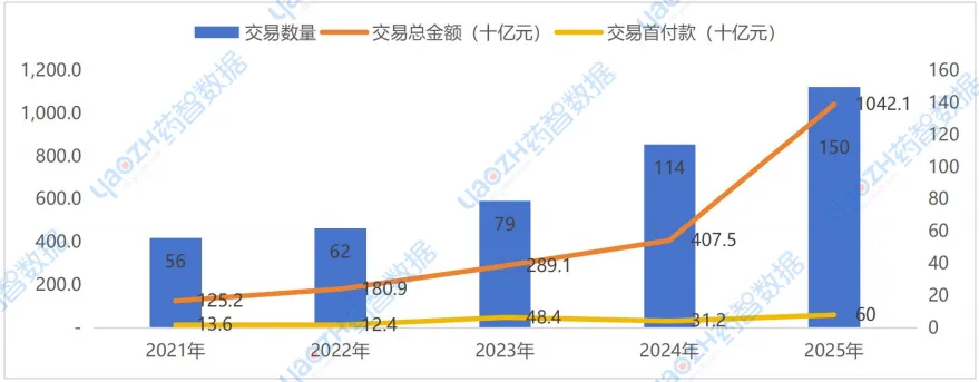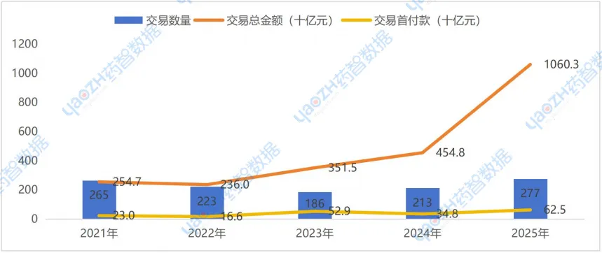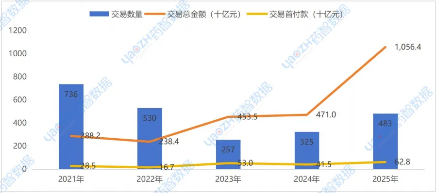 中国相关交易与全球交易趋势一致,根据药智数据不完全统计,2025年中国相关交易数量为483笔(同比增加48.6%),交易总金额呈爆发式增长,总金额增长至1.06万亿元(同比增加124.3%),交易首付款增至628亿元(同比增加51.3%)。