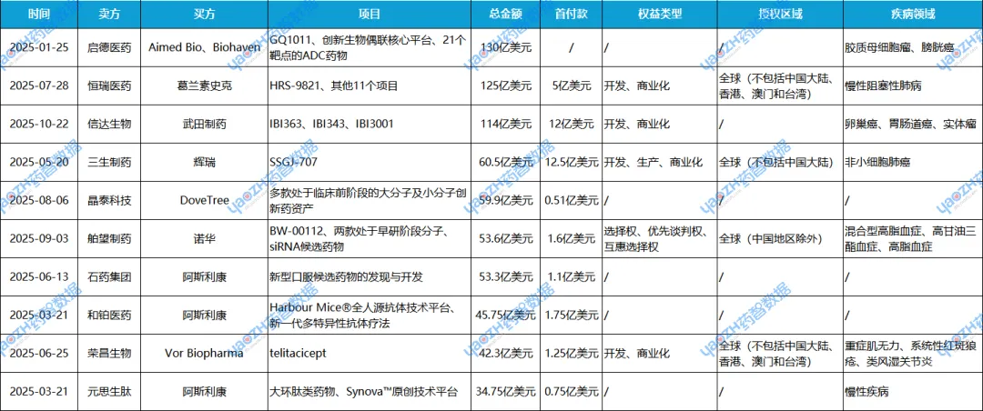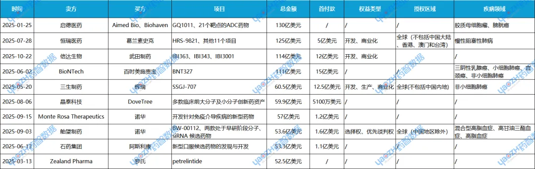 表2 2025年license out交易TOP10