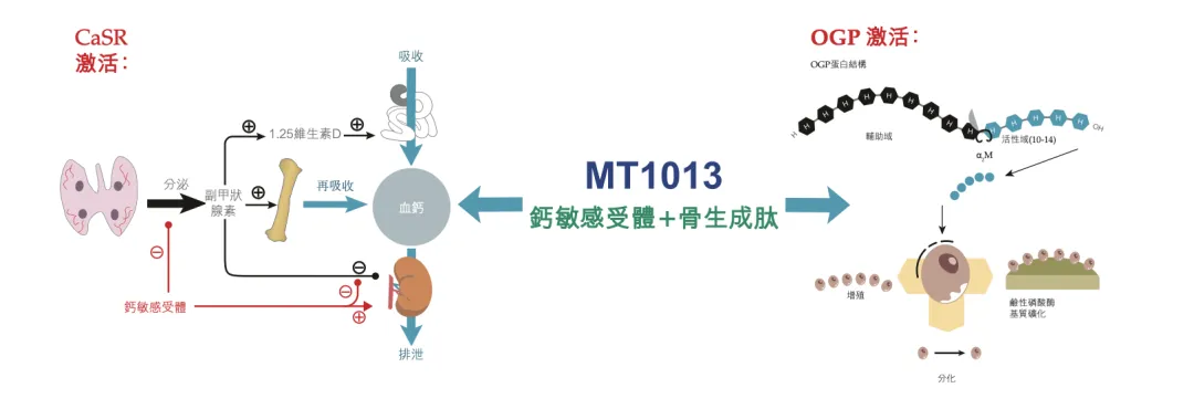 相较于传统CaSR激动剂,MT1013 在作用机制上实现了创新升级。其同时靶向钙敏感受体(CaSR)与成骨生长肽(OGP),在从源头上控制SHPT病情的同时,激活OGP通路主动促进骨形成与骨修复,实现了拟钙剂与骨合成代谢机制的协同治疗,完成了从"间接抑制骨吸收"到"主动促进骨生成"的治疗模式革新。