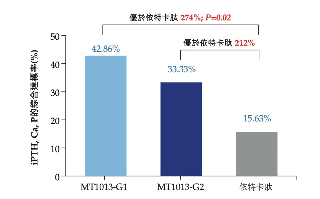 同时,其临床综合获益显著。在头对头试验中优于传统CaSR激动剂依特卡肽,Ⅱ期临床数据显示,MT1013可使患者甲状旁腺激素快速达标并长期稳定在150-300pg/mL的理想范围,iPTH、血钙、血磷三项关键指标综合达标率显著优于依特卡肽,三项指标同时达标的受试者比例约为依特卡肽组的2.5倍。而临床研究已证实,实现这三项指标有效控制的患者,心血管相关住院、心源性死亡及全因死亡风险均会显著降低。