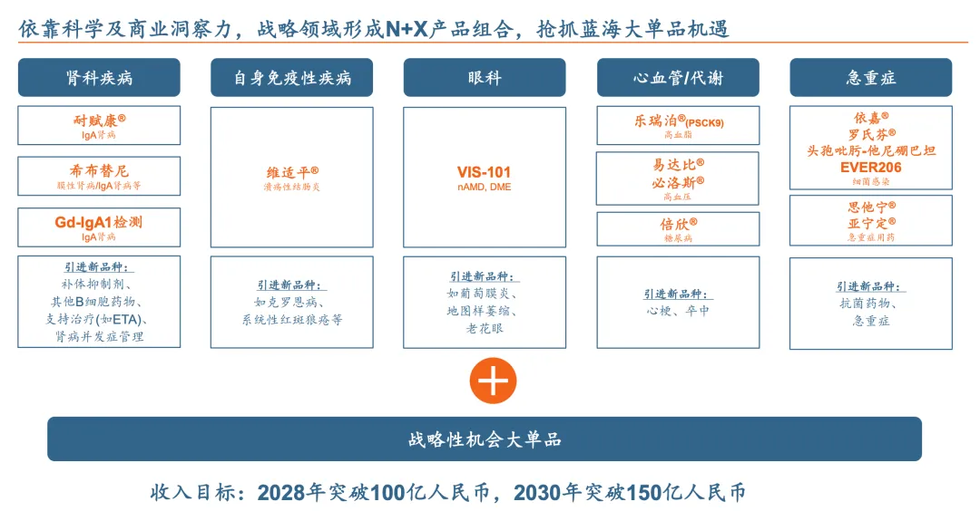 按照其规划,将通过持续引进布局,在肾科、自身免疫、急重症、心血管/代谢及眼科等重点治疗领域,形成层次清晰的“N+X”产品组合;未来5年将引进20个以上高价值资产,为2030年贡献60亿元收入,并助力2035年实现约300亿元收入的目标。