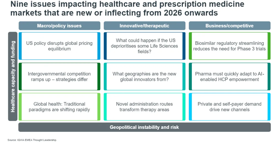 2026年全球医疗健康与生命科学领域迎来深刻变革。本文是IQVIA发布的Nine for 2026: Nine issues that are new or trend-breaking in 2026 for global Life Sciences and healthcare系列文章的第二篇,聚焦IQVIA对将在2026年及未来深刻影响处方药市场与全球医疗健康格局的最具影响力的新兴与突破性议题解读。
