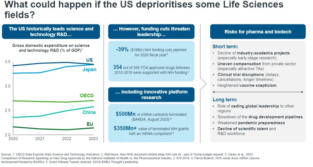 数十年来,美国始终是科研领域的领军者,持续助力研发管线,推出众多全球突破性药物。但如今,美国这一领先地位正面临挑战。例如,尽管美国国会强烈反对,但计划将美国国立卫生研究院(NIH)2026年的经费削减近40%的提案仍悬而未决。如此规模的资金削减,其产生的连锁反应将深刻重塑未来数年的全球科研格局。此外,美国近期的政府停摆事件也已埋下隐患,该事件将导致科研资助申请进程放缓,资金拨付周期陷入停滞。