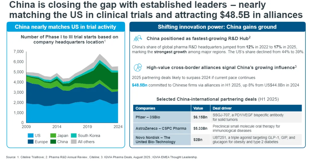 2025年,中国企业吸引了485亿美元的联盟融资,主要集中在肿瘤、免疫和肥胖症领域。辉瑞、阿斯利康、诺和诺德等国际制药巨头正积极开展合作,这也反映了中国数十年来的持续投入:打造研发基础设施、简化审批流程,并出台支持数据独占权的相关政策。如今,中国企业正向全球输出创新成果,行业竞争的进一步加剧也促使跨国药企重新审视其产品组合规划与风险管理。