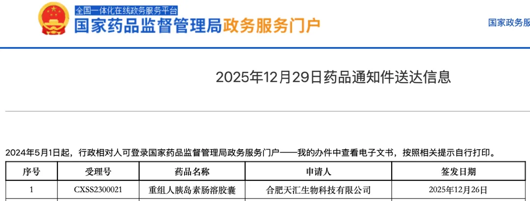 2023年时,天麦生物向国家药监局提交ORMD-0801的上市申请,但在两年的等待后未能等到“命运青睐”——2025年12月,国家药监局发布药品通知件送达信息(通常意味着药品上市申请“不予批准”,或是企业因预判无法过审而主动撤回上市申请),ORMD-0801赫然在列。