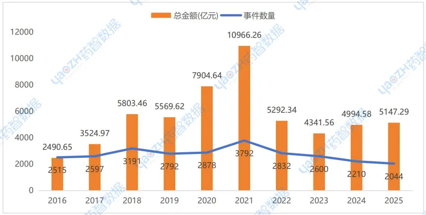 根据药智数据不完全统计,2016-2021年全球医疗健康行业投融资热度不断上涨,在2021年融资事件和融资金额均达到顶峰,2022年医疗健康行业投融资热度开始消退,进入 2025 年,这一趋势也并未扭转。2025年全球医疗健康行业在一级市场共发生融资事件2044起(同比下降7.51%),累计融资金额5147.29亿元(同比上涨3.06%)。无论从融资事件还是融资总金额来看,全球投资者在谨慎乐观中前行,既追逐着下一个改变游戏规则的“独角兽”,也在重新评估那些能够抵御周期波动、构建长期健康生态的基石型项目。