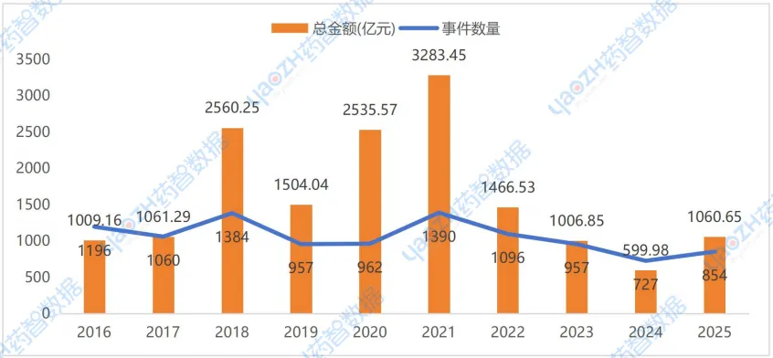 根据药智数据不完全统计,2025年国内医疗健康行业在一级市场共发生融资事件854起(同比上升17.5%,占比全球41.78%),累计融资金额1060.65亿元(同比上涨76.78%,占比全球20.6%)。2025年国内医疗健康行业的投融资活动基本与2023年水平持平,相比于2024年尤其是在融资金额方面有较大程度的增长。