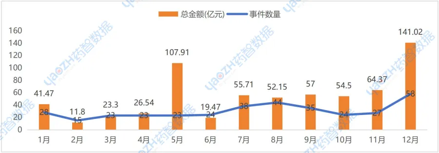 根据药智数据不完全统计,从月度趋势的融资事件数来看,2025年国内药品行业的融资高峰期为8月和12月,融资事件数分别达44起和58起;从月度趋势的融资金额数来看,5月和12月为融资高峰期,融资金额分别达107.91亿元和141.02亿元,12月为全年投融资活动最活跃的月份,其融资事件数和总融资金额数都是最多的月份;2月为全年融资低谷期,融资事件数和融资金额均处于最低水平。