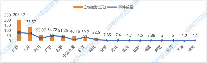 根据药智数据不完全统计,从融资地区的融资事件数来看,2025年中国药品行业融资活跃TPO5地区为江苏、上海、广东、北京、浙江,其对应的融资事件数分别为80起、74起、52起、42起、37起;从融资地区的融资金额数来看,2025年中国药品行业融资活跃TPO5地区为江苏、上海、四川、广东、北京,各自的融资金额分别为205.22亿元、135.57亿元、55.07亿元、54.72亿元、51.25亿元。