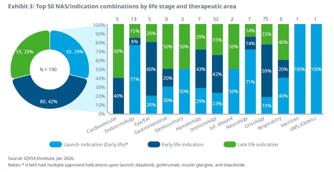 在这50个NAS的190个获批适应症组合中,近三分之一是在小分子药物首次获批后超过5年,或生物制剂获批后超过9年才获得首次批准(图3)。对于小分子药物,首次批准后5年内获批的适应症(包括上市时的适应症)被视为“早期适应症”;而超过5年后获批的适应症则被视为“后期适应症”。对于生物制剂,首次批准后9年内获批的适应症(包括上市时的适应症)被视为“早期适应症”;而超过9年后获批的适应症则被视为“后期适应症”。根据这一定义,有135个适应症属于早期适应症(涵盖全部50个NAS),而55个适应症属于后期适应症(涵盖50个NAS中的28个)。在共计190个适应症中,肿瘤(75个)、免疫(52个)和内分泌(13个)是最主要的治疗领域。所有治疗领域均存在至少两个NAS的后期适应症,且不仅限于最大的治疗领域,这表明后期适应症的广泛存在。若《通胀削减法案》的价格谈判条款在这些NAS上市时已生效,这些适应症可能将面临风险。