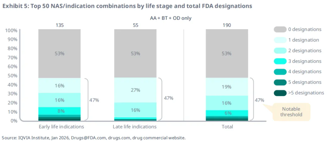 当统计每个适应症获得加速批准、突破性疗法认定和孤儿药认定的总数时,后期适应症与早期适应症获得至少一项FDA认定的概率相当,其中47%至少获得一项认定(图5)。早期适应症获得3项及以上FDA认定比例更高。