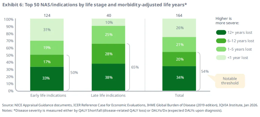 years),并考虑了现有治疗手段(图6)。疾病严重程度的衡量方式包括QALY缺口或每位患者的DALYs,这些指标会综合考虑现有治疗与护理标准。在具有可用疾病严重程度评分的40个后期适应症中,65%的适应症对应的疾病严重程度超过5个寿命QALYs/DALYs的损失;相比之下,在124个早期适应症中,只有50%达到这一严重程度。