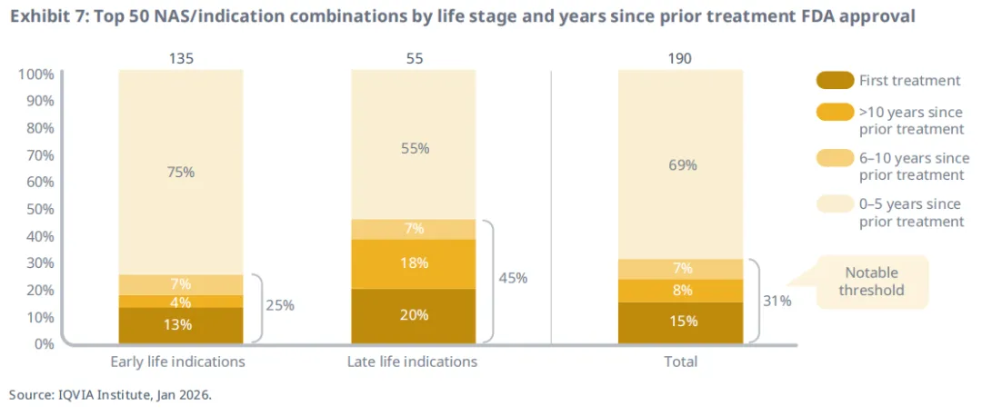 相比之下,早期适应症中仅25%属于五年内首创疗法,13%为该疾病史上首款获批药物,这凸显了后期适应症拓展在打破治疗僵局中的独特作用。