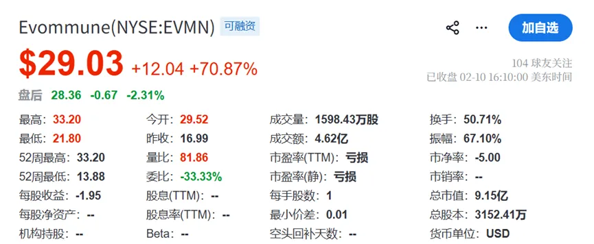 消息公布后,Evommune股价在盘前交易中应声大涨70%,迅速成为生物科技领域备受瞩目的焦点。