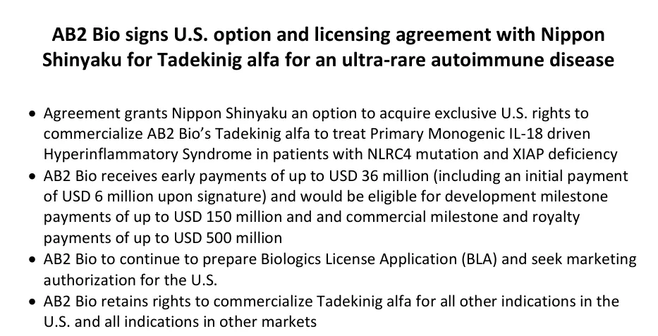 瑞士公司AB2 Bio开发的新型重组人白介素18结合蛋白Tadekinig alfa进展较快,已于2021年进入针对原发性单基因HLH患者的关键Ⅲ期试验。2025年,公司宣布日本Shinyaku以最高可达1.86亿美元的总金额获得了该药物在美国的许可权。AB2 Bio将继续筹备在美国提交其生物制品许可申请,以推动该适应症的上市批准。