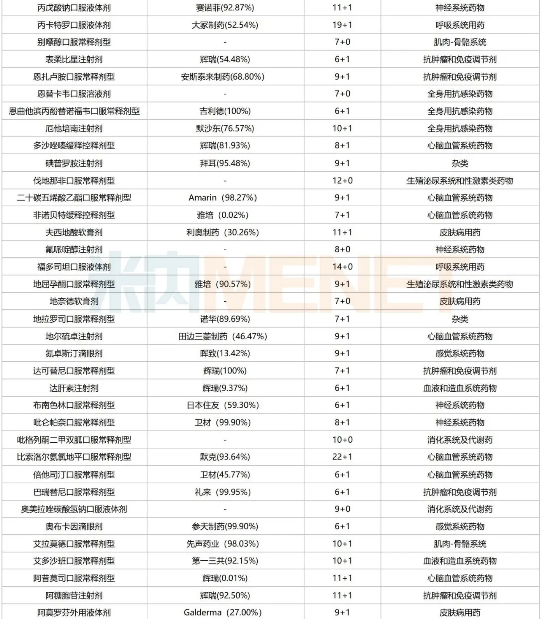 从企业情况看,预计在第十一批国采中,倍特药业、齐鲁制药、石家庄四药、科伦药业、复星医药、远大健康等为“主力军”,目前满足7家及以上的竞争条件的过评品种分别有38个、34个、32个、31个、30个、30个。