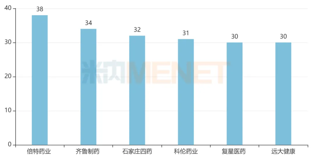 倍特药业以38个品种领跑,包括13个口服液体剂、12个口服常释剂型、10个注射剂、2个颗粒剂/散剂及1个吸入剂。其中,注射用盐酸万古霉素、乳果糖口服溶液、盐酸曲唑酮片、麦考酚钠肠溶片、复方氨基酸注射液(18AA-Ⅶ)、氨氯地平贝那普利胶囊等为2025年后新获批品种。