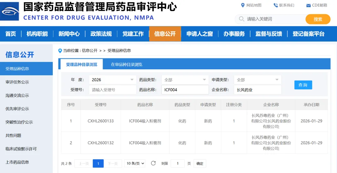 2026年2月24日,中国苏州—长风药业股份有限公司(港交所代码:2652.HK,以下简称“长风药业”或“公司”)宣布,公司自主研发的治疗肺纤维化的吸入粉雾剂候选药物 ICF004(化学药1类)新药临床试验申请(IND)已获中国国家药品监督管理局(NMPA)正式受理。