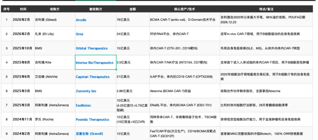 这背后,是MNC对优质细胞治疗资产的焦虑,但是这个焦虑并不全一样,需要分类讨论。我们可以整理一下从2024年到2026年的MNC收购细胞治疗公司的清单,通过下表,其实我们不难发现,从2024年以来,MNC收购CAR-T公司在大部分情况下,花费的金额并不算多,吉利德这次确实很例外。这就是MNC焦虑的不同所在。大部分MNC所焦虑,是比较远的未来,是下一个时代甚至下两个时代的东西,近一些的,例如亘喜生物的双靶点CAR-T,远一些的,则为体内CAR-T和同种异体CAR-T,适应症也大部分是治疗自身免疫病。换个角度说,大部分MNC买回biotech指望它们短时间内产生现金流吗,指望它们短时间内增厚EPS吗?自然不是。