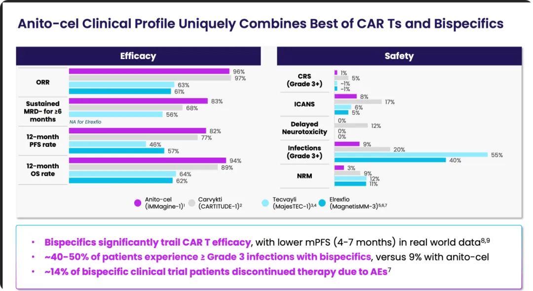 但是呢,anito-cel的竞争对手或许不止CAR-T,更不止Carvykti。我们都不去提BMS的Abecma,它确实竞争力非常不行。但TCE双抗,是我们绕不开的问题:即CAR-T未来和TCE双抗甚至三抗的竞争应该怎么看?