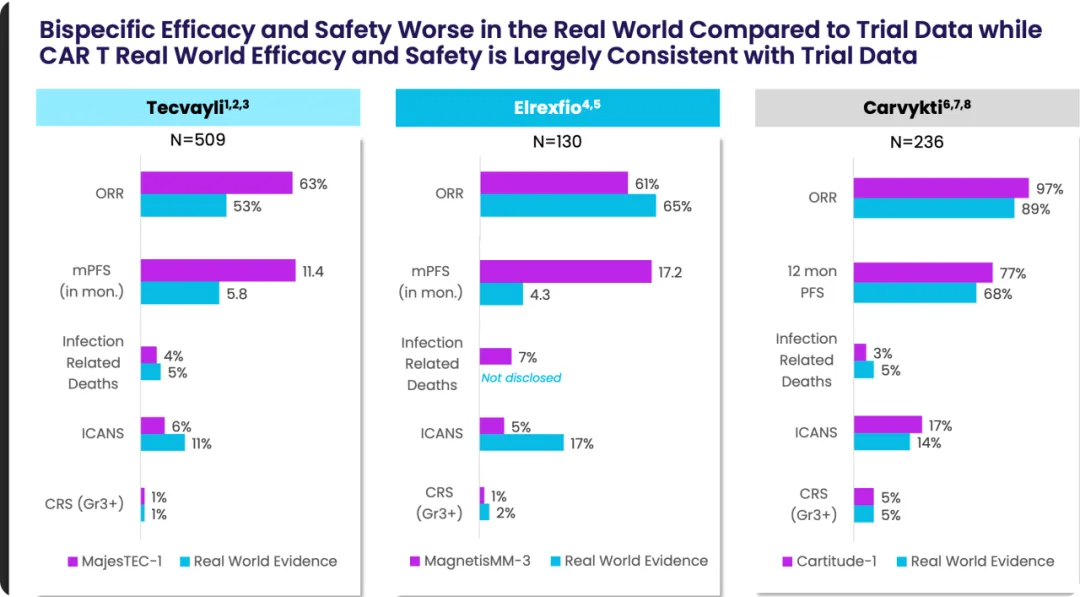 从疗效上来说,这方面有一个问题笔者没有意识到,但是Arcellx披露了。即:对于TCE双抗而言,临床数据和真实世界疗效差距较大,无论是tecvayli还是Elrexfio,这两款TCE双抗的mPFS临床试验和真实世界的生存期差距实在太大,例如Elrexfio,其临床数据mPFS达到了17.2个月,但是真实世界数据的mPFS连4.3个月都没达到。在这方面,CAR-T疗法要好很多:例如Carvykti,其12个月mPFS率虽然在临床和真实世界有差距,但是差距是可以接受的(77% VS 68%),没有双抗直接砍一半以上这么夸张。
