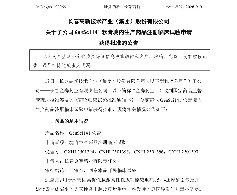 受子公司金赛药业GenSci141软膏临床试验获批消息刺激,长春高新尾盘直线涨停。GenSci141软膏的战略意义,远不止于一个新适应症的成功申报。它与金赛药业的核心命脉——生长激素,形成了完美的战略协同。