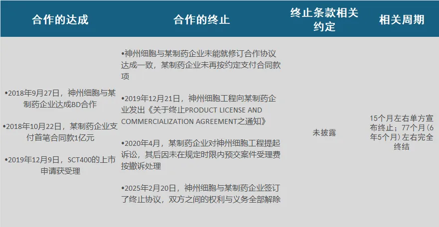 例如,在神州细胞子公司与某制药企业终止合作案例中,神州细胞子公司神州细胞工程有限公司(“神州细胞工程”)(许可方)与某制药企业(被许可方)签订《产品许可与商业化协议》,约定双方就管线代号为SCT400的CD20单克隆抗体注射液(“SCT400”)进行商业化合作,授权区域为中华人民共和国(包括香港特别行政区、澳门特别行政区及台湾地区);其后,神州细胞工程以某制药企业重大违约为由单方面解除了上述与某制药企业签订的《产品许可与商业化协议》。直到双方达成BD合作后的第6年,双方才就此项BD合作签订了终止协议,确认双方之间的权利与义务全部解除。