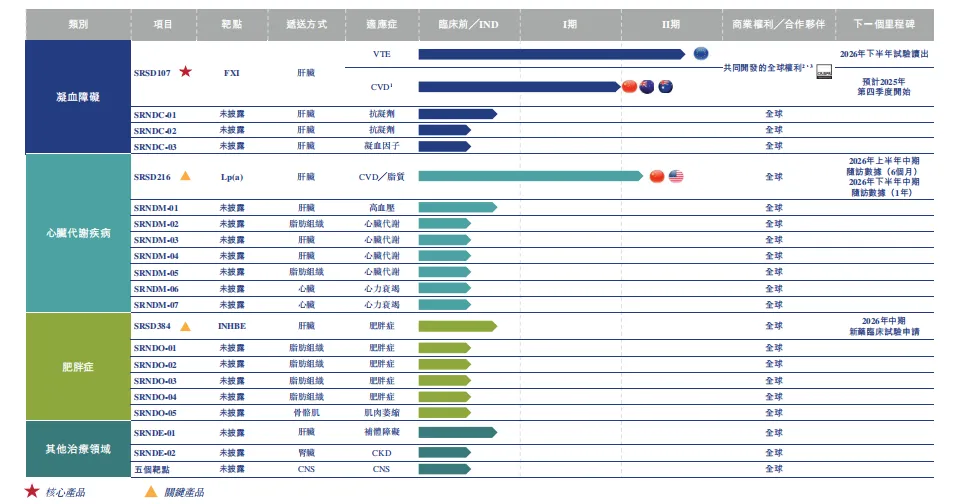 核心产品SRSD107是一款潜在FIC靶向凝血因子XI(FXI)的siRNA药物,主要用于治疗血栓栓塞性疾病,其亮点在于可在降低血栓风险的同时减少出血风险,目前正于欧洲开展II期多中心临床试验,并计划在中国及澳大利亚/新西兰启动另一项II期试验,进一步拓展临床数据支撑;