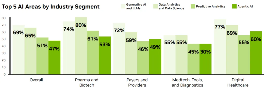 此外,数字医疗(78%)、制药与生物科技(74%)、医疗科技(70%)成为AI应用第一梯队,