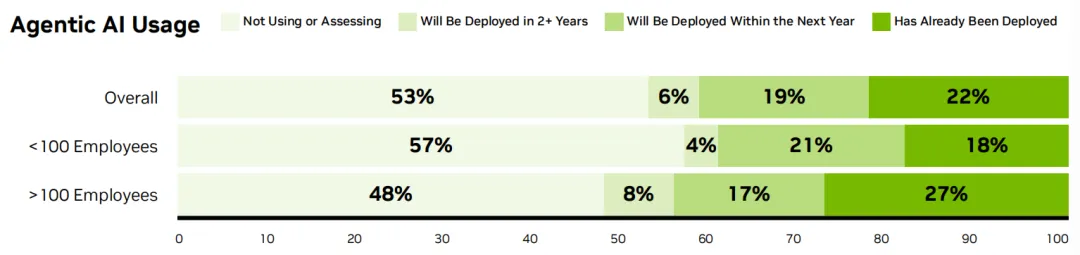 近一半的受访者称正在使用或评估智能体,另有19%的人表示将在一年内部署智能体。