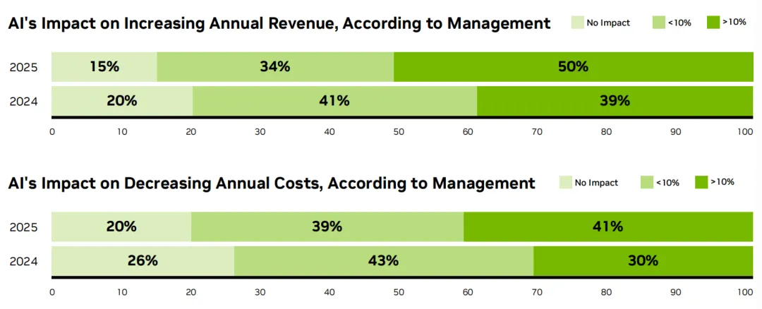 85%的管理层表示,AI帮助他们提升了收入;认为AI帮助降低成本的占比达到了80%。