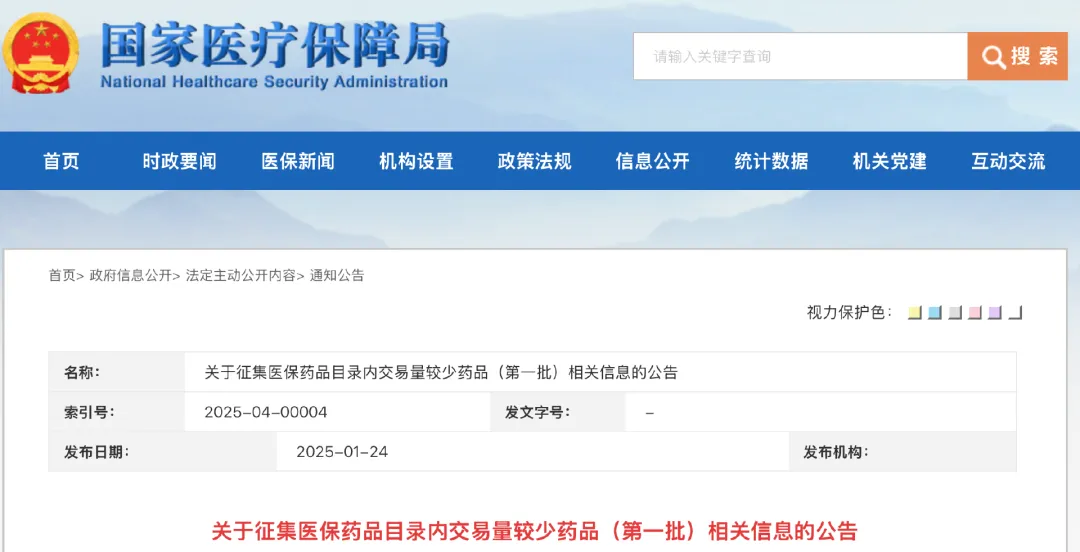 2025年1月24日,国家医保局发布《关于征集医保药品目录内交易量较少药品(第一批)相关信息的公告》,表示发现部分药品长期未在省级医药采购平台交易或交易量较少,有的药品在国家医保信息业务编码标准数据库中的市场状态长期维护为“停产”。