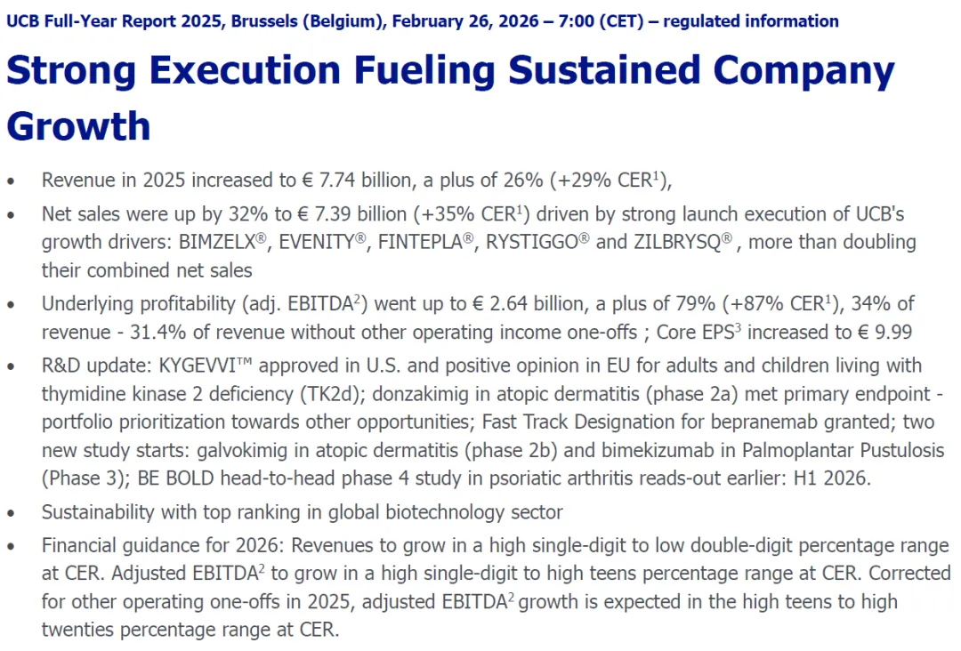 2026年2月26日,优时比发布2025年财报,全年营收77.4亿欧元,同比增长26%。
