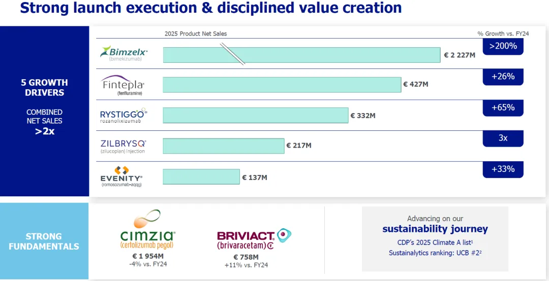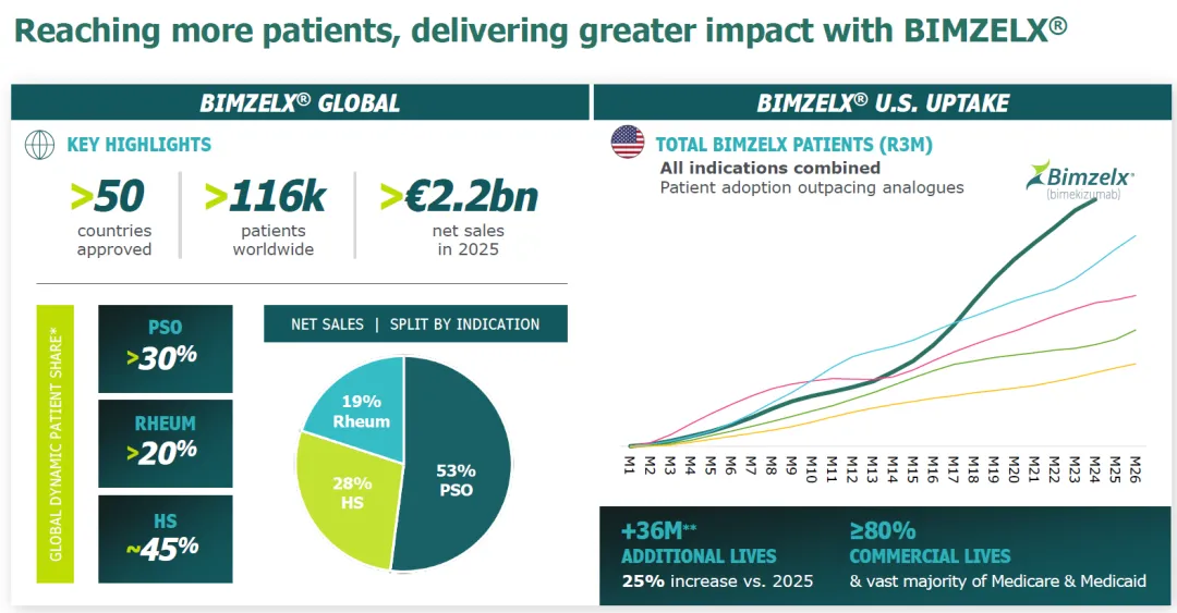 的优时比全球首创IL-17A/F抗体Bimzelx 2025年销售额22.27亿欧元,相比于2024年的6.07亿欧元增长2.67倍。