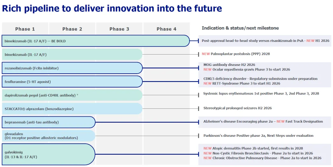 优时比已将自免作为核心业务,正在开展Bimzelx头对头对比IL-23抗体的临床研究,FcRn抗体已经获批上市,后续还有迭代自免双抗/三抗,包括IL-13/IL-22双抗、IL-13/IL-17A/F双抗等。