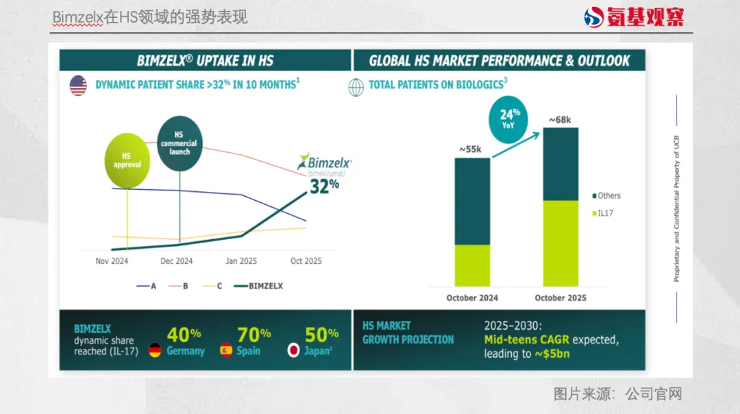 在美国市场,年内新增3600万人群覆盖。在化脓性汗腺炎适应症领域,它可以说是展现出了统治力:该适应症于2024年11月在美国获批,当年12月实现商业化,到了2025年10月,其市场份额已经逼近32%,并且从趋势来看即将登顶。