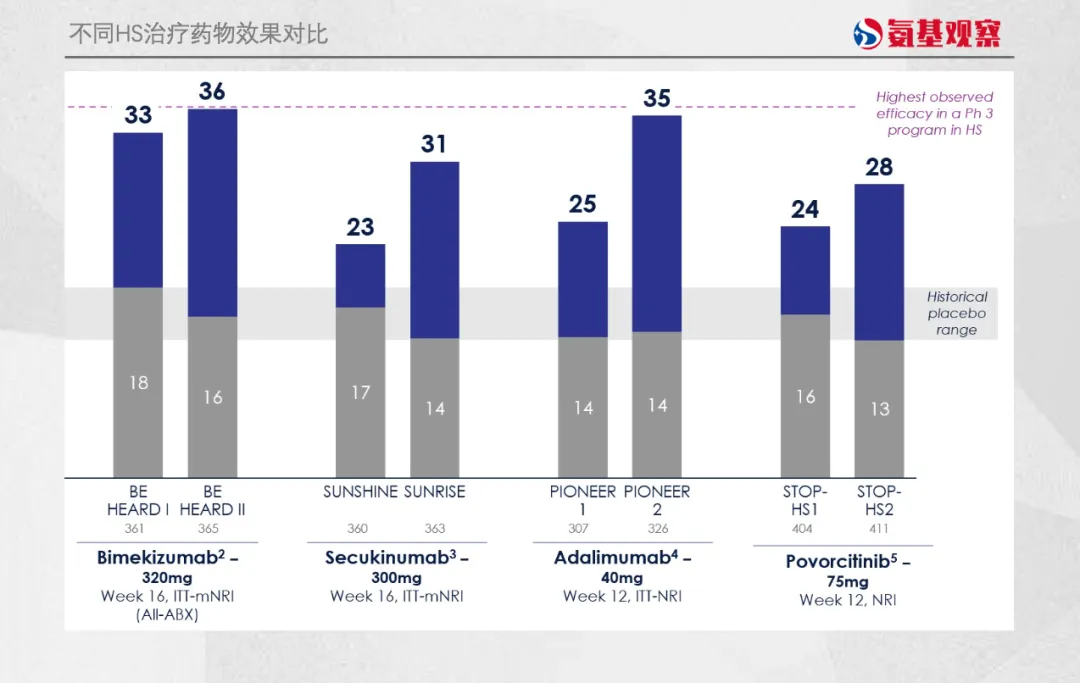 潜在的机制优势,在临床实践中得到了验证,典型如表现强势的HS领域。该领域的研究终点是HiSCR75达标率,这一指标指的是治疗后满足以下全部3个条件的患者比例: