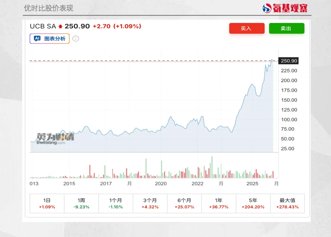 而同样是IL-17类药物,Bimzelx不仅在欧美市场逆流而上,甚至在抢夺司库奇尤单抗等先驱的市场份额。截然不同的境遇,也带来了巨大差别:Bimzelx销售额持续向上,也为优时比带来了可观的股价涨幅。