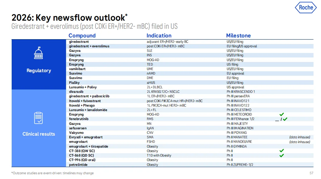 2026 年,罗氏有望迎来众多里程碑进展,其中包括多个新药的上市获批,以及 10 项 Ⅲ 期临床数据的公布。
